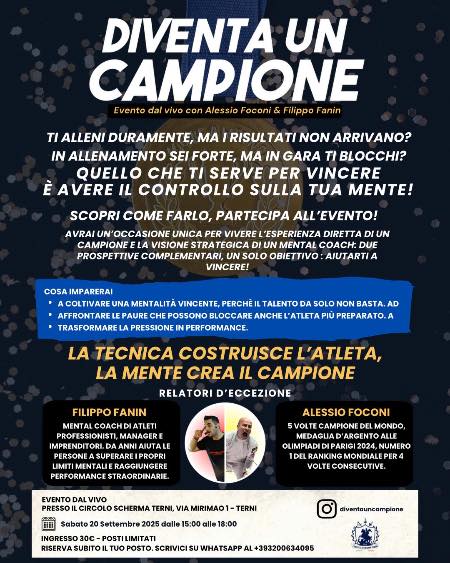 Dalla pedana, che gli ha regalato successi infiniti, al tavolo di una conferenza in cui si parlerà dell’importanza del mental coach nello sport, e non solo, per sfruttare al meglio le proprie potenzialità. Stiamo parlando di Alessio Foconi che nel corso della sua carriera ha potuto registrare significativi miglioramenti nella sua espressione tecnica. E insieme al campione ternano, per chi se ne fosse dimenticato o non lo sapesse è stato campione del mondo per ben 5 volte, medaglia d’argento alle Olimpiadi di Parigi e primo nel ranking mondiale di fioretto per 4 volte consecutive, ci sarà alla conferenza il suo mental coach, Filippo Fanin, altro personaggio di primissimo piano e non solo nel mondo dello sport. Il tema in discussione sabato pomeriggio al Circolo della Scherma di Terni dalle 15 alle 18 è “ La tecnica costruisce l’atleta, la mente crea il campione”. Ci si può iscrivere su whatsapp al numero 3200634095. Lo abbiamo incontrato stamane al Circolo della Scherma di Terni e ci ha parlato dell’evento.