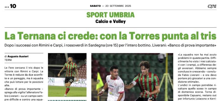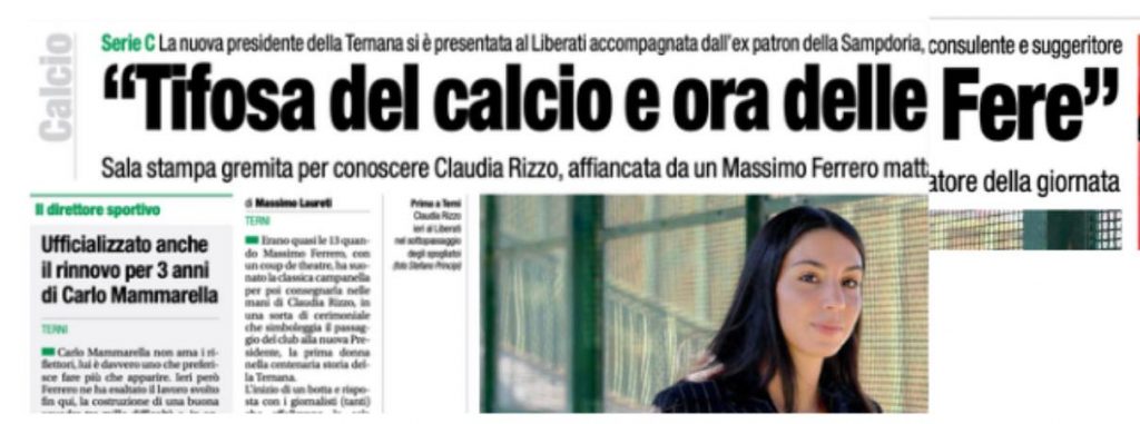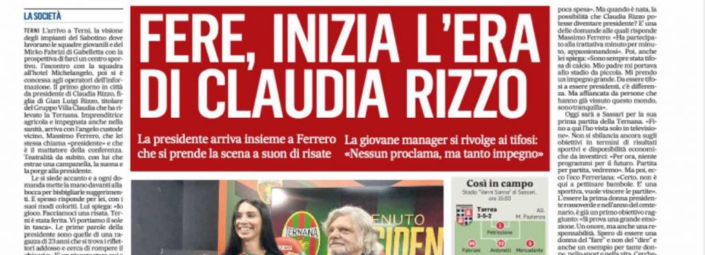 I tre quotidiani con cronaca locale dedicano il loro spazio sia all’aspetto agonistico ovvero alla partita che la Ternana deve sostenere oggi contro la Torres in terra sarda sia alla conferenza stampa di presentazione della nuova società. Per quanto concerne quest’ultima, poi, spazio alle parole pronunciate dalla giovane presidente, Claudia Rizzo, ai suggerimenti rivoltele da Massimo Ferrero oltre al prolungamento ed adeguamento contrattuale a Carlo Mammarella.