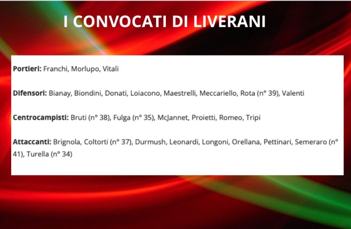 26 i giocatori convocati da Fabio Liverani per la partita di Coppa Italia che si disputerà domani sera, martedì, al Liberati a partire dalle 20,30. Molti coloro che staranno a guardare a cui il tecnico rossoverde concede di tirare il fiato soprattutto a coloro che hanno un minutaggio importante. Non sono tra i convocati, infatti, i difensori Martella e Capuano, i centrocampisti Garetto, Ndreka e Vallocchia e gli attaccanti Ferrante e Dubickas. Questo l’elenco diramato dal tecnico rossoverde, Fabio Liverani.