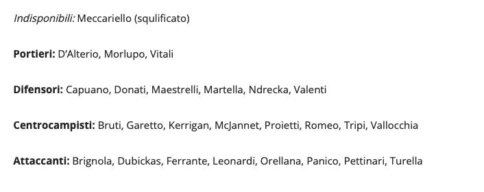 Dopo la conferenza stampa di questa mattina di Fabio Liverani l’ufficio stampa ha diramato l’elenco dei convocati per la partita di domani pomeriggio. Questo l’elenco dal quale non compaiono i nomi di Durmush e di Byanaj, due giocatori in prestito e che potrebbero tornare alle loro società di provenienza, rispettivamente, Pisa e Torino, mentre c’è quello del nuovo arrivato, Giuseppe Panico. Tra i presenti anche Martella che ha quindi recuperato dal fastidio muscolare accusato alla vigilia del match contro l’Ascoli.